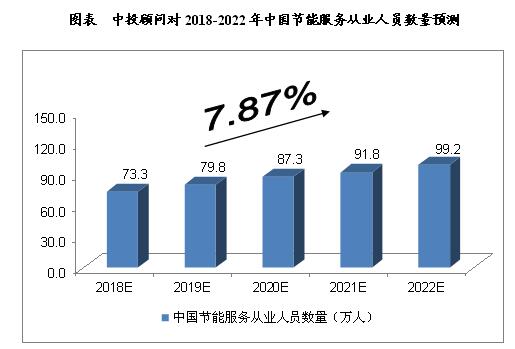综合以上因素,我们预计,2018年我国节能服务从业人员数量将达到73.3万人,未来五年(2018-2022)年均复合增长率约为7.87%,2022年将达到99.2万人。
