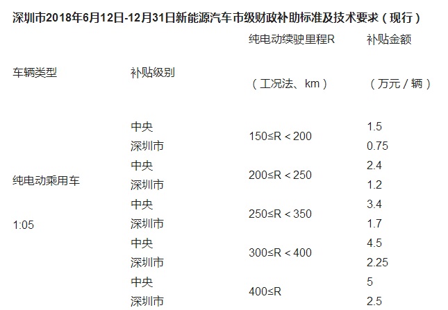2、2018年2月12日至2018年6月11日上牌的新能源乘用车、纯电动客车,按照深圳市2017年补贴标准的0.7倍补贴,纯电动货车和专用车按对应标准的0.4倍补贴,燃料电池汽车补贴标准不变。