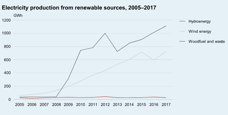 可再生能源的电力生产逐年增加,2017年的增长率与2016年相比增长了13%。风电产量同比增长15%,占可再生电力总产量的近40%。木质燃料和其他可再生能源的电力生产显着增加(10%)。
