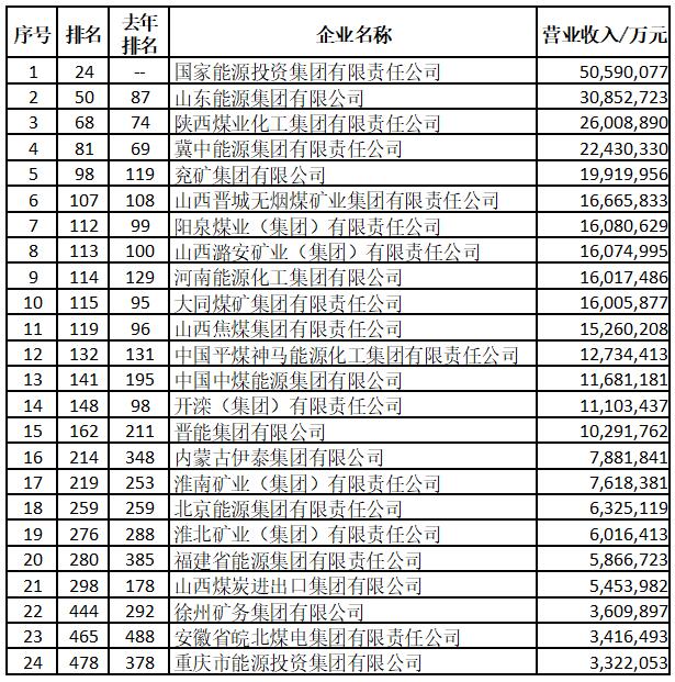 共有24家煤炭企业上榜,较去年持平,共实现营业收入3.41万亿元。其中,15家煤企营业收入超1000亿元,较去年增加2家;国家能源集团、山东能源集团、陕西煤业(601225)化工集团、冀中能源(000937)集团等4家企业营业收入超2000亿元。12家煤企的排名较去年有所提升,1家持平,其余下降。