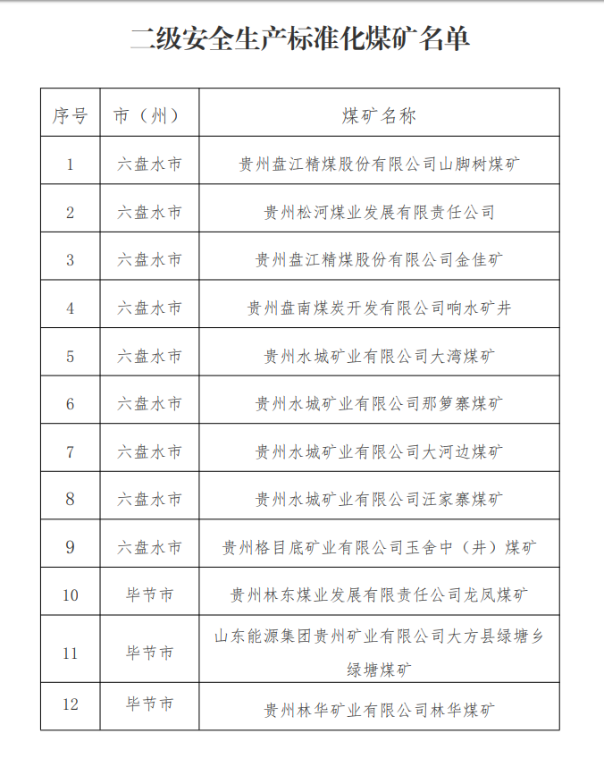 贵州省安全生产监督管理局关于公布二级安全生产标准化煤矿名单的通知六盘水市安全监管局、毕节市安全监管局,水城煤监分局、毕节煤监分局,有关煤矿企业:按照《煤矿安全生产标准化考核定级办法(试行)》和《煤矿安全生产标准化基本要求及评分方法(试行)》(煤安监行管〔2017〕5 号)、《贵州省煤矿安全生产标准化考核定级实施细则(试行)》(黔安监煤矿〔2017〕2 号)规定,经市级标准化主管部门初审、省安全监管局资料审查、现场检查考核和网上公示,确认贵州盘江精煤股份有限公司山脚树煤矿等 12 处矿井(名单附后)为二级安全生产标准化煤矿,现予以公布。自公布之日起生效,有效期 3 年。