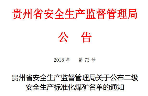 9月12日,贵州省安监局发布《关于公布二级安全生产标准化煤矿名单的通知》,共12家煤矿列为二级安全生产标准化煤矿。