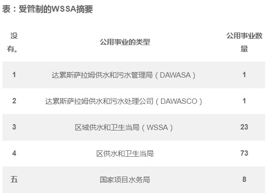 目前,EWURA管理130个供水和卫生当局,为区域和地区总部,小城镇和国家项目水务局提供供水和卫生服务,如负责水资源部长宣布的受管制WSSA列表所示, 并总结如下。