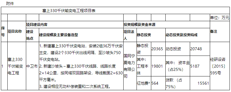 一、为提高中卫地区电网供电能力和供电可靠性,强化对110千伏及以下电网的支撑,满足中卫北部地区及中卫工业园区新增负荷及区域新能源发展需要,同意建设塞上330千伏输变电工程,国网宁夏电力有限公司作为项目法人,负责投资项目的建设、经营及贷款本息偿还。