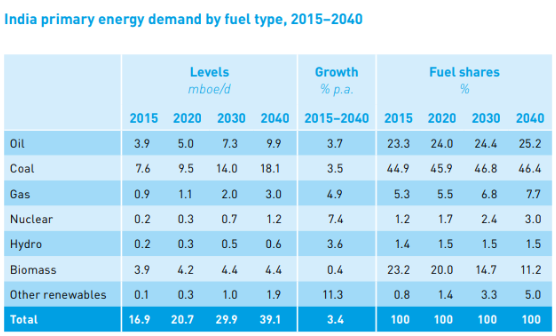 以印度和中国为首的发展中国家预计将占一次能源总需求增长的95%。报告指出,预计2015 - 2040年期间印度和中国的能源需求将分别增加约22 mboe / d和21 mboe / d。