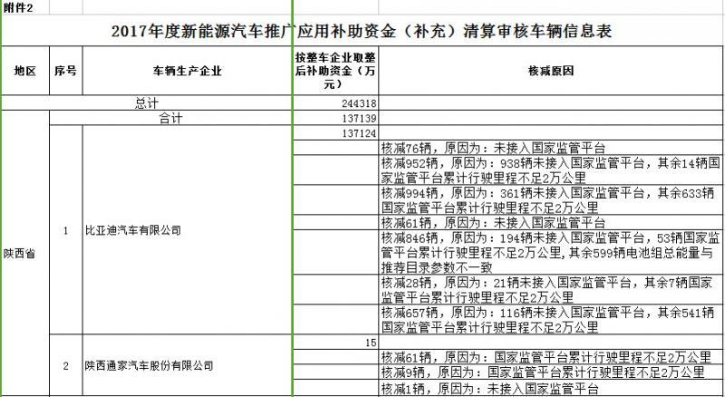 2017年度,新能源汽车补贴补充清算金额总计24.43亿元,陕西省、深圳市、浙江省的补充清算新能源汽车补贴分别为13.71亿、3.32亿、7.4亿。其中,深圳比亚迪和陕西比亚迪分别获得补充清算新能源汽车补贴3.32亿、13.71亿,约占2017年补充清算的新能源汽车补贴总金额的70%。另外,吉利汽车和湖南众泰分别获得新能源补贴2.73亿和4.37亿。