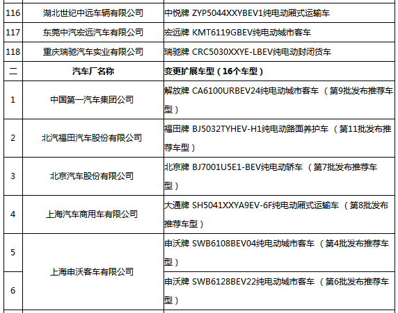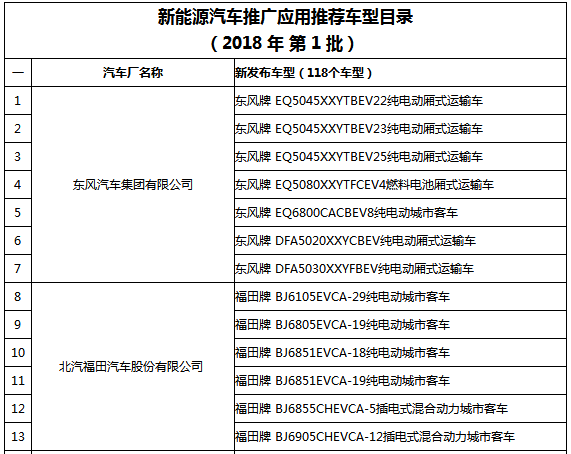 2018年1月31日 《新能源汽车推广应用推荐车型目录》(2018年第1批)下发,新发布车型118个,变更扩展车型16个。