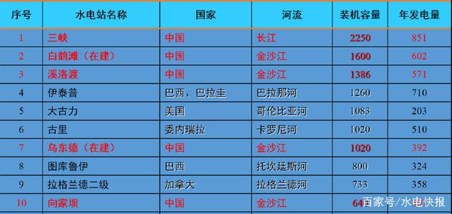 此外还有乌东德电站装机1020万千瓦,排在第7;向家坝电站装机容量640万千瓦,排在第10。榜单的前三名,均被我国占据,足见我国水电建设的成就和实力,真是厉害了,我的国!