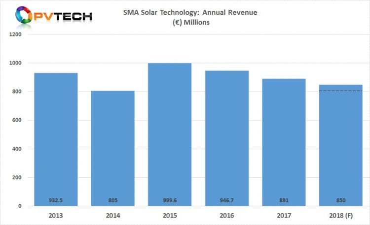 SMA Solar表示,它将2018年的预期收入降至8亿欧元至8.5亿欧元,低于此前预期的9亿欧元至10亿欧元。
