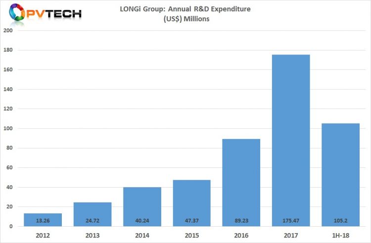 根据PV Tech对主要光伏制造商研发支出趋势的年度分析,LONGi集团是2017年最大的消费者,超过1.75亿美元的研发活动。该公司已于2018年在研发活动上花费超过1.05亿美元。