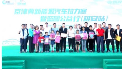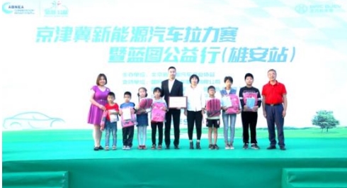 【众嘉宾和刘庄小学师生一起为京津冀新能源汽车拉力赛暨蓝图公益行雄安站点赞】