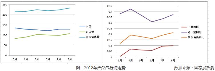 随着中国城镇化过程中居民能源消费结构的变化,以及环保监管日趋严格的背景下燃气替代煤炭供电供热需求的提升,天然气下游消费需求急速增长。发改委数据显示,截止8月底,天然气表观消费量累计达1804亿立方米,同比增长18.2%。进入冬季采暖季后,天然气阶段性需求量预计将进一步增加。