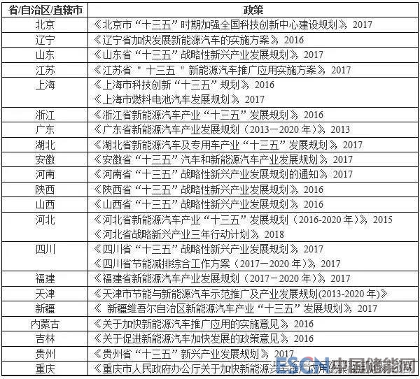 早在2001年,科技部发布的“国家“863”计划重大专项”就将燃料电池汽车研究开发列入其中;到了近些年,紧密出台的《节能与新能源汽车产业发展规划(2012—2020年)》、《中国制造2025》、《能源技术革命创新行动计划(2016-2030年)》、《国家创新驱动发展战略纲要》、《“十三五”国家战略性新兴产业发展规划》以及《汽车产业中长期发展规划》等文件,均明确提及要重点研发氢能与燃料电池技术,表现出中央政府对该新型能源技术的大力支持。此外,多个省/自治区/直辖市也积极布局燃料电池产业,形成了巨大的引领效应(统计如下表)。