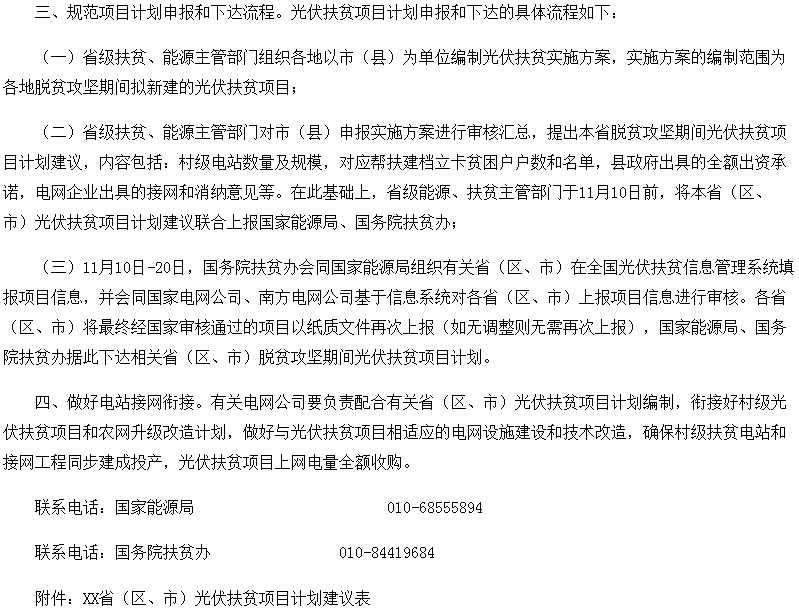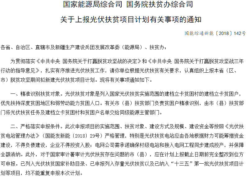 10月10日,国家能源局综合司、国务院扶贫办综合司关于上报光伏扶贫项目计划有关事项的通知指出,光伏扶贫对象是列入国家光伏扶贫实施范围的建档立卡贫困村的建档立卡贫困户,优先扶持深度贫困地区和弱劳动能力贫困人口。
