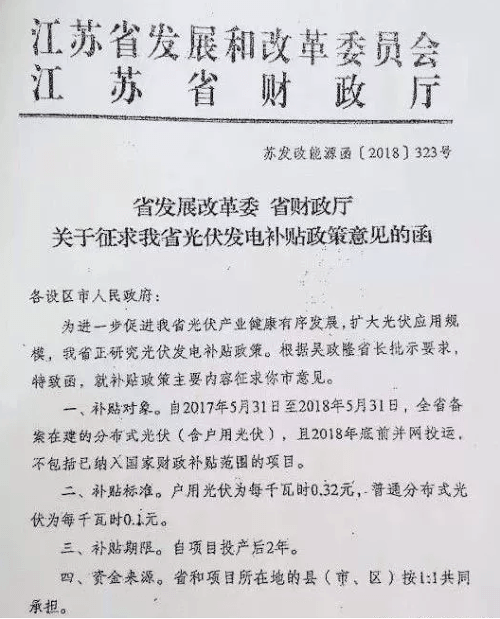 而昨日,江苏省也拟出台光伏补贴政策,根据征求意见函:
