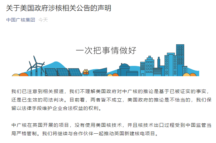 中广核回应美涉核公告:英国核电项目未使用美国技术