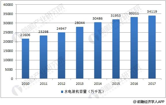 近几年我国水力发电装机容量逐年增长,据前瞻产业研究院发布的《中国水力发电行业市场前瞻与投资战略规划分析报告》数据显示,截至2017年底,我国水电总装机容量约3.4亿千瓦,约占电力总装机的20%、非化石能源装机的50%以上。结合十三五规划目标预期,未来三年水电装机平均复合增速为3.68%,预计未来三年水电新增装机增量为1255.58万千瓦、1301.78万千瓦、1349.69 万千瓦。