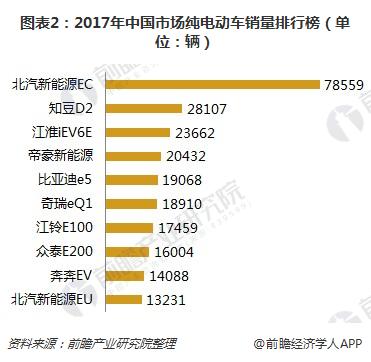 从车型来看,在2017年,北汽新能源EC、比亚迪宋插电混动版分别占据纯电动汽车销量与插电混动汽车销量排行的头位,分别为78559辆和21674辆;其中北汽新能源EC的销量与其后品类拉开差距,优势明显。
