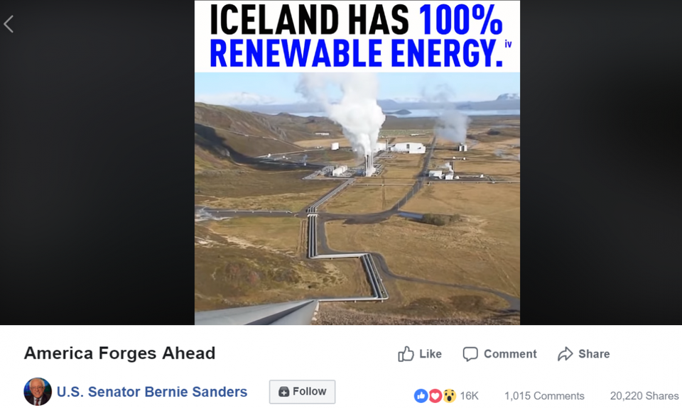 例如,上周参议员伯尼桑德斯 在他的Facebook页面上分享了 关于地热能的视频。这个两分钟的视频由“ 岁月项目 ”完成,其任务是“全球讲故事和教育工作,以便在气候变化面前为世界提供信息,赋权和团结。”
