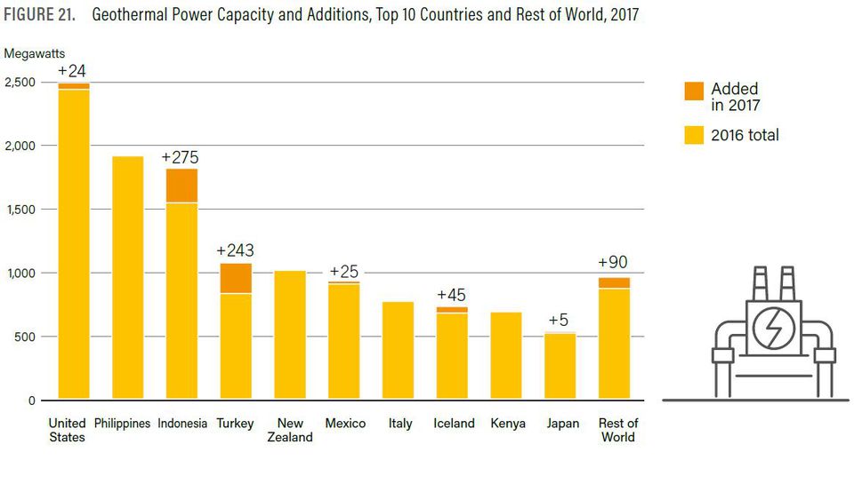 但随后视频进入了神话,美国现已注意到冰岛的成功,并正在复制它。事实上,美国一直是地热发电领域的全球领导者。 美国是世界上最大的地热发电厂,冰岛的地热能力是其五倍多。今年的可再生能源全球状况报告显示,美国实际上比世界其他国家领先多少: