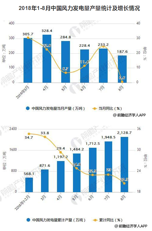 在风电发电量方面,2018年相比去年同期也显著增加。据前瞻产业研究院发布的《风电行业市场前瞻与投资战略规划分析报告》统计数据显示,2017年8月份风力发电量产量为182.7万吨,同比增长24.3%。2017年1-8月份产量达1715.7万吨,累计增长20.5%。2018年8月份风力发电量产量为187.6万吨,同比增长0.6%。2018年1-8月份中国风力发电量产量达2128.7万吨,同比增长20.5%。
