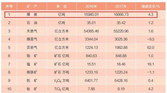 报告显示,截止到2017年底,我国煤炭查明资源储量为16666.73亿吨,增长4.3%;2017年煤炭新增查明资源储量为815.56亿吨。