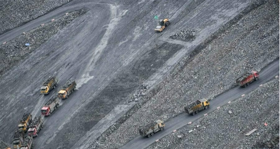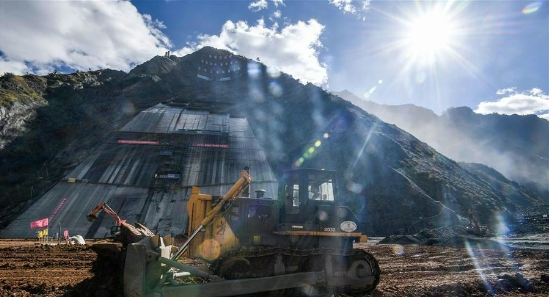 施工车辆在两河口水电站大坝上游堆石区进行作业