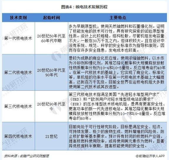 从核电站技术演变来看,主要可划分四代核电技术。其中,第一代是实验性的核电站,目前已经基本全部退役;第二代是以压水堆/沸水堆为主标准化、系列化和批量化建设的商业堆,是目前在运机组的主力;第三代是安全性更高的核电站,是目前在建机组的主力,处于加速推广期;第四代目前仍处于在研发阶段。