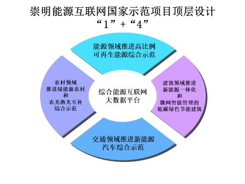 崇明互联网+ 智慧能源(能源互联网)项目以实现城市级100% 可再生能源利用为发展目标,多业态多能互补的能源城域网系统架构将探索形成。其顶层设计内容可概括为“1”+“4”,即“一平台”:综合能源互联网大数据平台。“四领域”: 交通领域推进新能源汽车综合示范;能源领域推进高比例可再生能源综合示范;农村领域推进绿能新农村和农光渔光互补综合示范;建筑领域推进新能源一体化和微网智能管理的低碳绿色节能建筑。