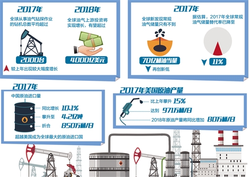 2014年油价下跌以来,为应对低油价,全球主要石油公司普遍采取向核心业务聚焦策略,大幅削减投资,作业钻井量明显下降。2017年随着油价逐渐回升,全球油气勘探走出低谷,钻机作业量“止跌回升”。统计显示,去年全球从事油气钻探作业的钻机总数平均超过2000台,较上年出现较大幅度增长。2017年美国页岩油气并购金额达到220亿美元。勘探工作量和并购金额的增长,表明全球油气勘探迎来了春天。业内预计,2018年全球油气上游投资将实现增长,有望超过4000亿美元。