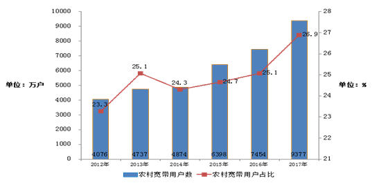 2017年末,电信业完成3.2万个行政村通光纤的电信普遍服务任务部署。全国农村宽带用户达到9377万户,全年净增用户1923万户,比上年增长25.8%,增速较上年提高9.3个百分点;在固定宽带接入用户中占26.9%,占比较上年提高1.8个百分点。