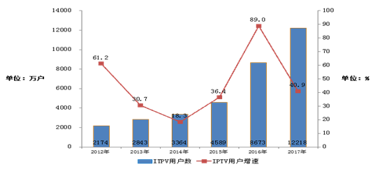 加快培育新兴业务,扎实提高IPTV、物联网、智慧家庭等服务能力。2017年末,IPTV用户数达到1.22亿户,全年净增3545万户,净增用户占光纤接入净增用户总数的53.5%。