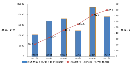 2012-2017年移动宽带用户(3G/4G)发展情况