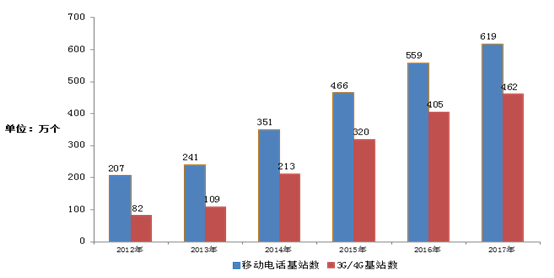 2017年,三大运营商着力提升网络品质,加快光纤网络建设,完善4G网络覆盖深度,不断消除覆盖盲点,移动网络服务质量和覆盖范围继续提升。2017年,全国净增移动通信基站59.3万个,总数达619万个,是2012年的3倍。其中4G基站净增65.2万个,总数达到328万个。