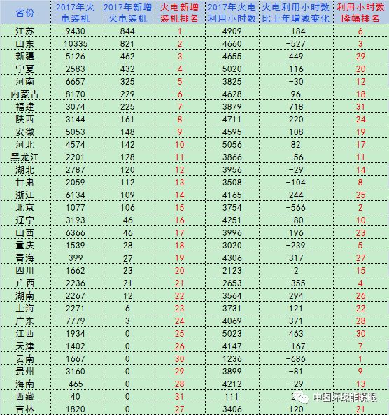 火电新增装机排名靠前、而火电利用小时数降幅较小的省份有新疆(2,29)、类似的省份有宁夏(4,20)、内蒙古(6,18)、福建(7,31)和陕西(8,24)。火电新增装机排名靠后而火电利用小时数降幅较大的省份有云南(30,1)、贵州(29,9)、海南(28,13)和天津(26,7)。(说明:括号内容为排名情况:2017年火电新增装机排名,2017年火电利用小时数比上年增减情况排名)