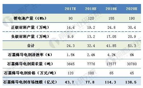 根据前瞻产业研究院《2018-2023年中国新材料行业市场前瞻与投资战略规划分析报告》预计,2020年导电剂市场规模为51.3万吨,如果按照石墨烯导电剂在正负极材料中添加比为6%计算的话,到2020年,石墨烯在锂电池导电剂方面的需求量为51.3万*6%=3.078万吨。如果2020年石墨烯价格能如期降至50-80美元/千克(5-8万美元/吨,折约34-52万元/吨),我们取折中45万元/吨,那么2020年石墨烯在导电剂领域的市场就有138.5亿元。