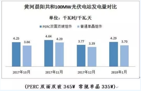 事实上,不仅仅是测算数据,越来越多的实际电站运行数据也在证实着PERC双面双玻组件的高电力产出。一组来自国内首次大规模应用PERC双面双玻组件的黄河晨阳共和100MW光伏电站的对比数据显示,与常规单晶相比,PERC双面双玻组件的单瓦发电量平均提高13.35%。