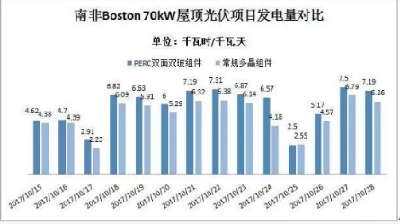另一组数据则来自于南非Boston70kW屋顶光伏项目,该项目系非洲地区首个双面双玻光伏项目,电站运行数据显示,PERC双面双玻组件发电量增益超过14%。