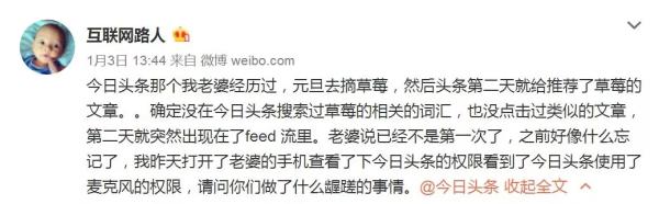 阿里系这边,旗下子公司支付宝被爆出在“年度账单”活动中,靠默认勾选套取用户数据;腾讯系也不消停,先是吉利控股董事长李书福公开质疑微信偷看用户聊天记录,几天后腾讯和广州市政度试推出的全国首张“微信身份证”又被指责“动机不纯”;撇开这两家,号称中国最大的内容平台的今日头条,被质疑利用手机麦克风获取用户数据隐私……