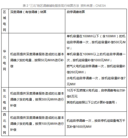 《关于促进电储能参与“三北”地区电力辅助服务补偿(市场)机制试点工作的通知》已经允许储能参与电力辅助服务,但相关的结算机制并未确定。在现行主要以火电机组参与的电力辅助服务市场中,“三北”地区调峰的结算方式如下: