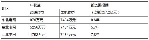 同样以桥湾变电站120MW/240MWh独立储能电站为例,假设一天参与两次调峰,且储存的电量在用电高峰时段按照风电上网电价卖出(按0.5元/kWh计算),充放电效率90%,一年按365天计算,则不同地区的收益情况如下表: