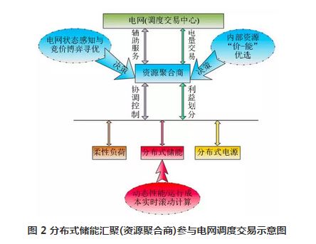 总体而言,已有研究大多针对集中式大容量的储能系统,而对于分布式储能参与电网辅助服务的协同控制技术研究还较少。如何构建规模化分布式储能汇聚效应的动态仿真模型,协调控制多点布局的分布式储能以及柔性负荷,亟需开展相关内容的深入研究与应用。有研究定义了负荷聚合商概念,因此进一步可以扩展到储能参与需求响应和提供辅助服务中,将会出现“资源聚合商”,未来资源聚合商将汇聚若干分布式用户储能参与电力市场交易,基本框架如图 2 所示。