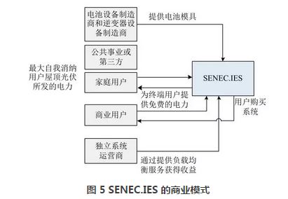 目前,与分布式光伏组合形成的分布式光储系统在国外已有较多的商业应用,在不同的国家,分布式光储发电的应用重点各不相同,美国加州在工商业领域的分布式项目居多,澳大利亚和德国市场的重点在户用储能领域。以德国 SENEC.IES 公司为例,该公司将用户侧储能聚集起来开展“免费午餐”模式,享有对电池的主要控制权,当电网“零电价”时控制电池从电网充电。用户主要通过最大化地自我消纳屋顶光伏所发的电力、使用 SENEC.IES 提供给用户的“免费储存的电力”,实现更低的电费账单,进而获益。SENEC.IES 的商业模式见图5。