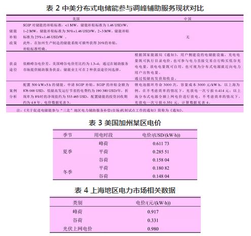 对分布式储能的经济评价,需要量化储能的投资运行费用、政策的补贴、工作模式如削峰填谷和配合新能源接入等带来的收益以及节能减排等其它收益。由于新能源出力的不确定性,可以使用典型日提取、信息决策理论等方法对储能带来的收益进行量化评估,建立相应的目标函数,评估储能投资的可行性。分布式储能参与系统调峰目前在美国已经实现商业化运营,针对这一应用模式就目前中美两国的应用现状进行比较,如表 2 所示。