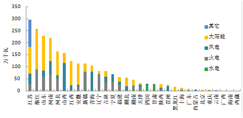 新增装机类型主要以太阳能发电装机为主,占总装机的56.0%,太阳能发电新增装机主要分布在浙江、山东、江苏、江西等省份(新增装机100万千瓦以上);
