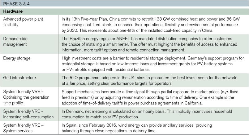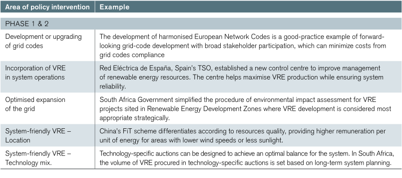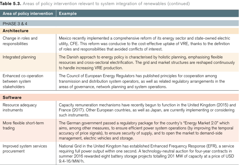 表5.3显示按电力系统阶段和层次分列的政策干预领域,并举例说明。