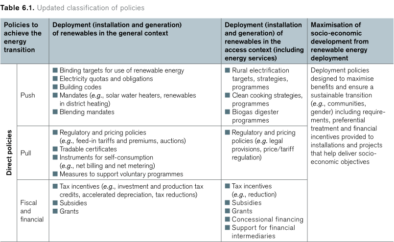 表6.1 提出了更新的可再生能源政策分类:直接政策文件,一体化政策,以及扶持政策。
