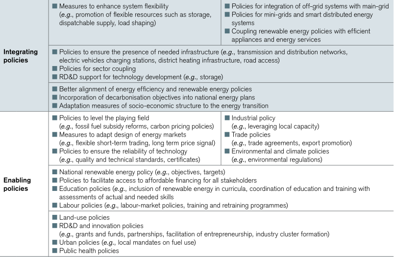 实现能源转型,需要的不仅仅是针对能源部门制定的政策更为全面。能源领域的迅速变化需要一种新的政策分类方式,这涉及到能源系统的转变和它赖以生存的社会经济结构的转变。这期间的政策需要采取综合办法,兼顾这两个方面。随着可再生能源从利基转向主流,推动转型的政策不仅必须涵盖可再生能源的部署,还必须纳入影响可持续性和转型速度的更广泛的能源系统和经济政策。