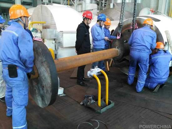 发电机抽转子。自盘车停运开始,本体班加班加点,仅四天时间就完成发电机端盖、轴瓦、氢冷器、导风圈等拆除工作,比计划工期提前一天具备抽转子条件。抽转子主要利用发电机励侧的地锚作为受力牵引点,通过“滑板平移法”将转子缓慢拉至定子镗外,期间全靠行车操作工与地面链条葫芦的默契配合。