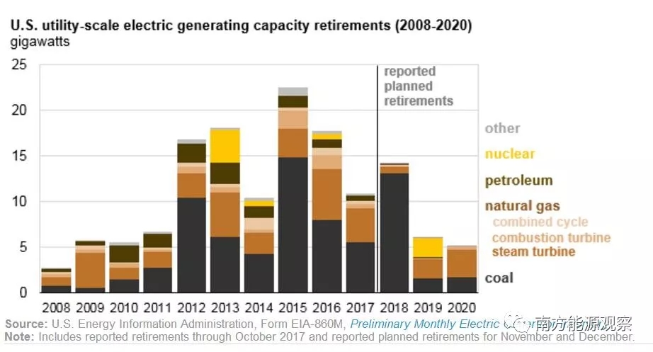 影响发电机组退役的因素有很多。例如,2008年以来退役的燃煤电站相对较为老旧(平均52年)且装机容量小(105 MW)。而正在运行的燃煤电站寿命通常为39年、装机容量达319兆瓦。其他影响因素还包括区域电力使用情况发生了变化,联邦或州政策对机组运行的影响,以及国家层面鼓励使用其他燃料(如可再生能源)等因素。